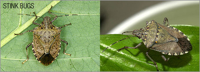 - Stink bugs are true bugs in the insect order Hemiptera. There are many different types of stink bugs, but the one that is plaguing us now is the brown marmorated stink bug, Halyomorpha halys. Accidentally introduced ten years ago in Pennsylvania, it bears the classic shield shape of its family and grows to be about Vi long. Dappled brown, it has a tan underside and a series of black and white markings along the edge of its body